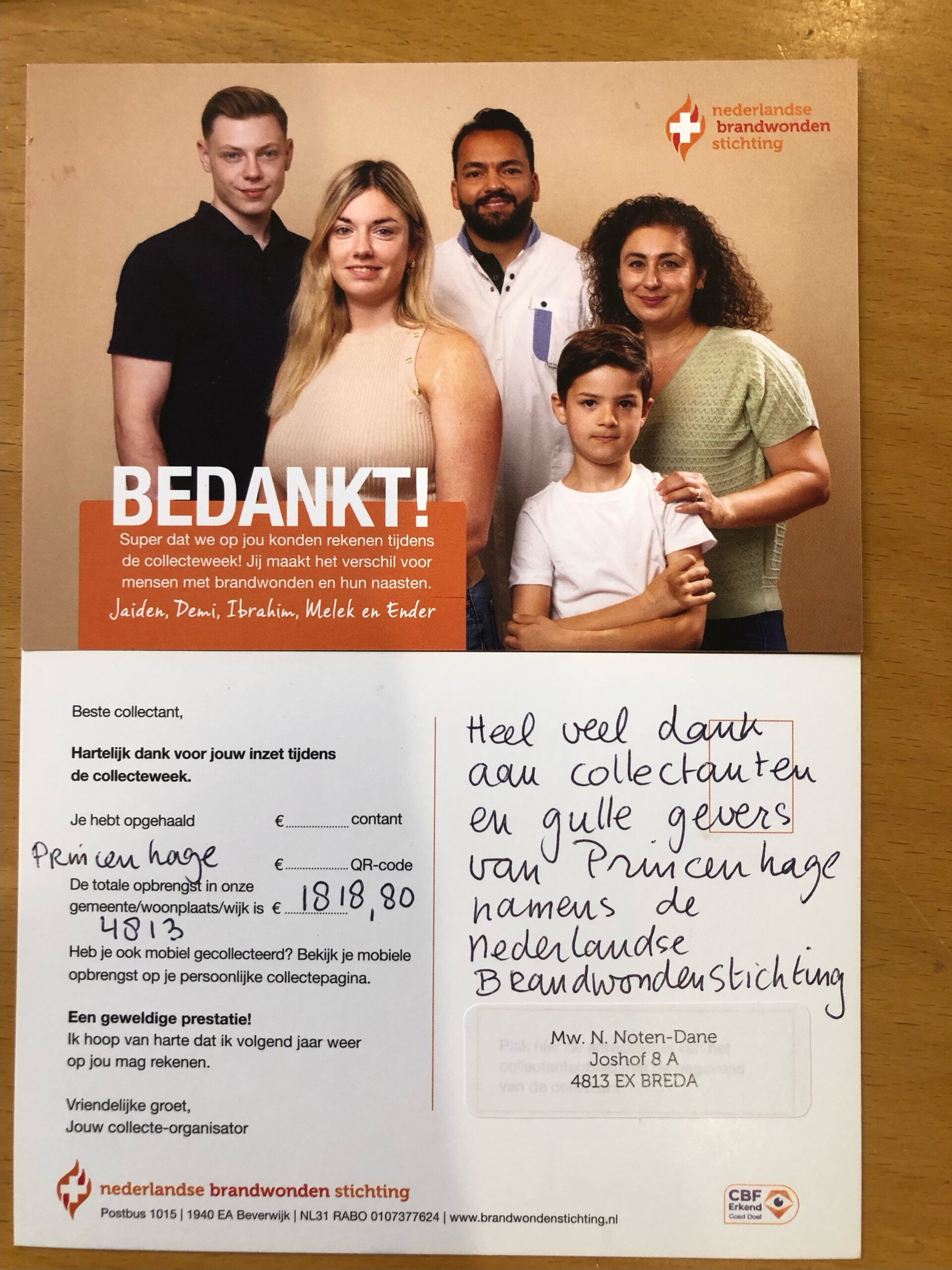Onlangs werd de jaarlijkse collecte van de De Nederlandse Brandwonden stichting gehouden. Inmiddels is bekend wat deze collectie in Princenhage heeft opgebracht, namelijk het mooie bedrag van € 1818,80