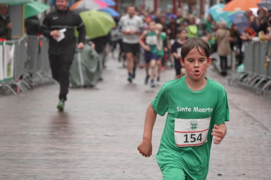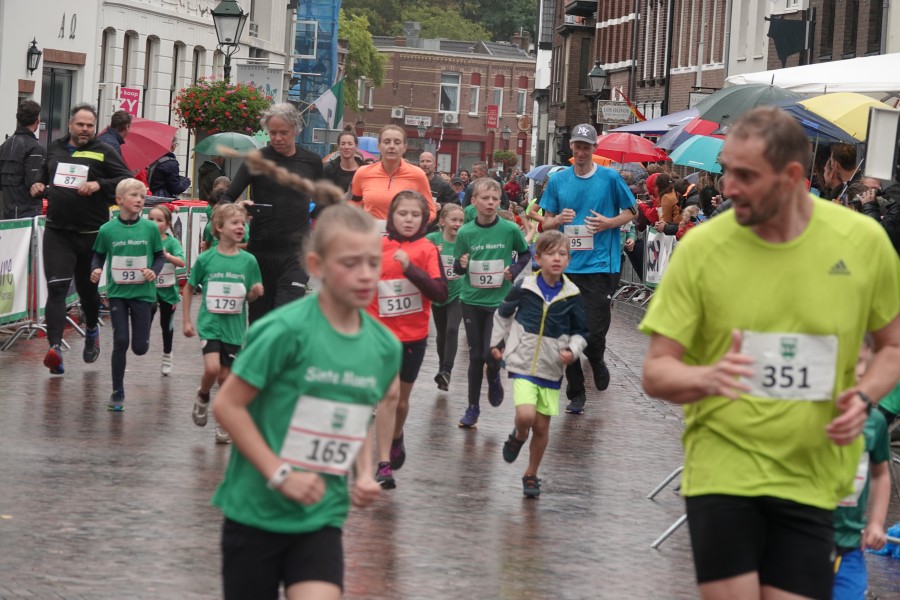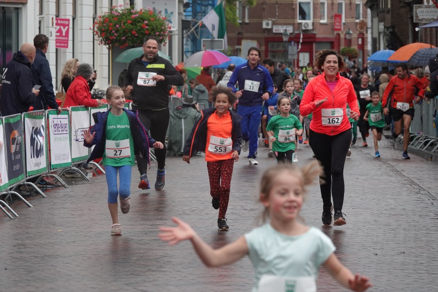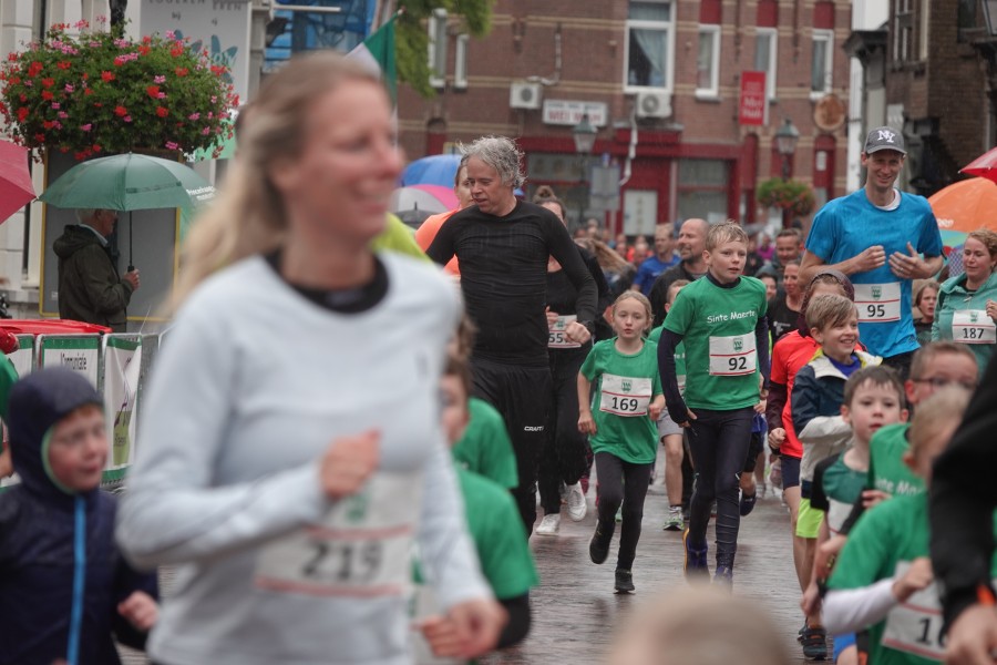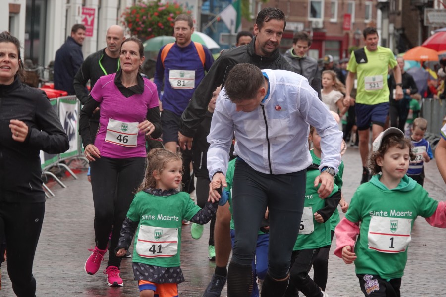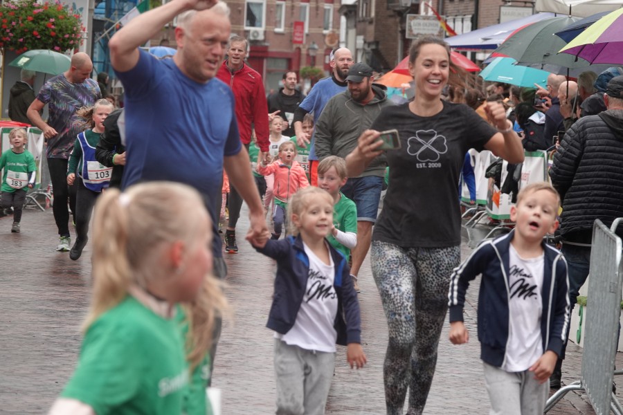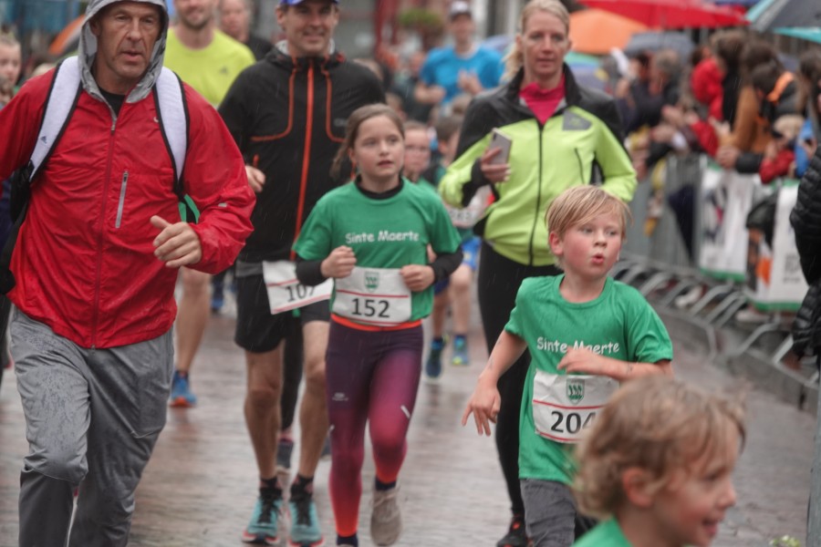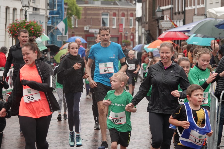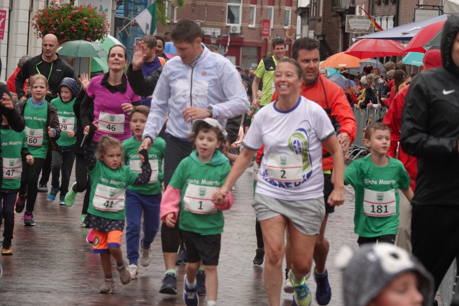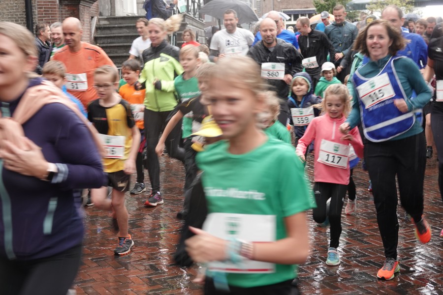 Onder droge omstandigheden begonnen de eerste lopers, alleen de snelsten kwamen droog over, maar de regen kon de pret niet drukken. Menig record sneuvelde en voor anderen was het gewoon een overwinning op jezelf. Zo had ieder zijn eigen motivatie om deel te nemen. Vervolgens ging de tien kilometer van start onder regenachtige omstandigheden. Gelukkig viel de regen mee toen de familieloop startte. Na een goede warming-up ging ook die van start, de ene liep een ronde de fanatiekeling onder ons liepen er zelfs drie. Gelukkig was iedereen voor de grote stortbui binnen.