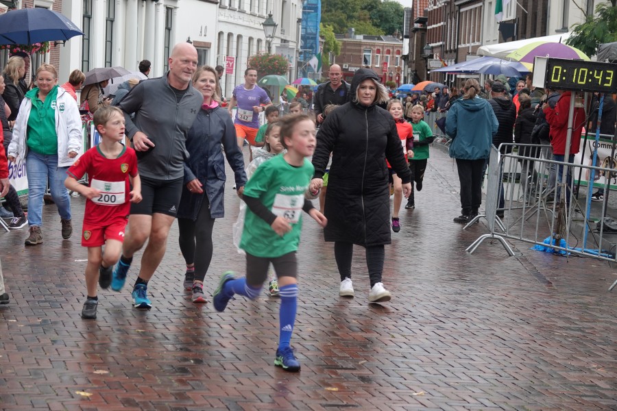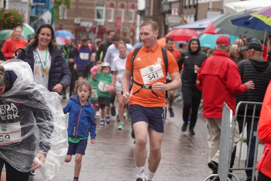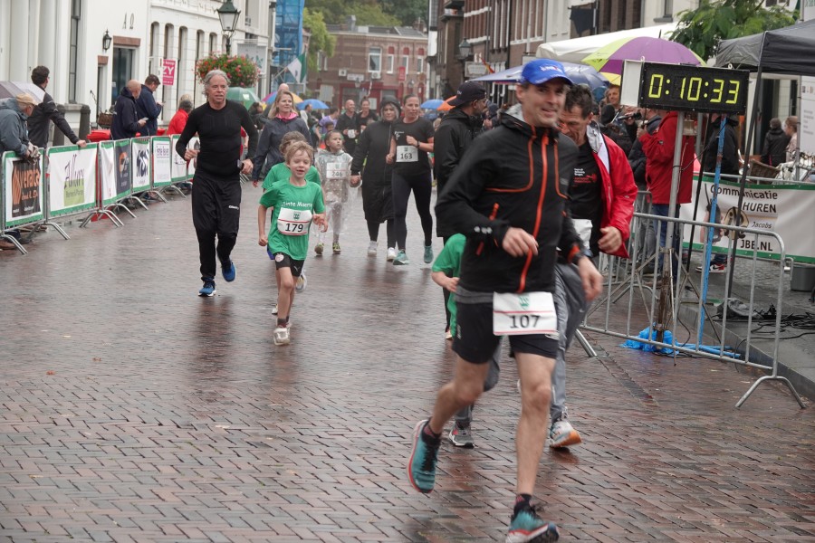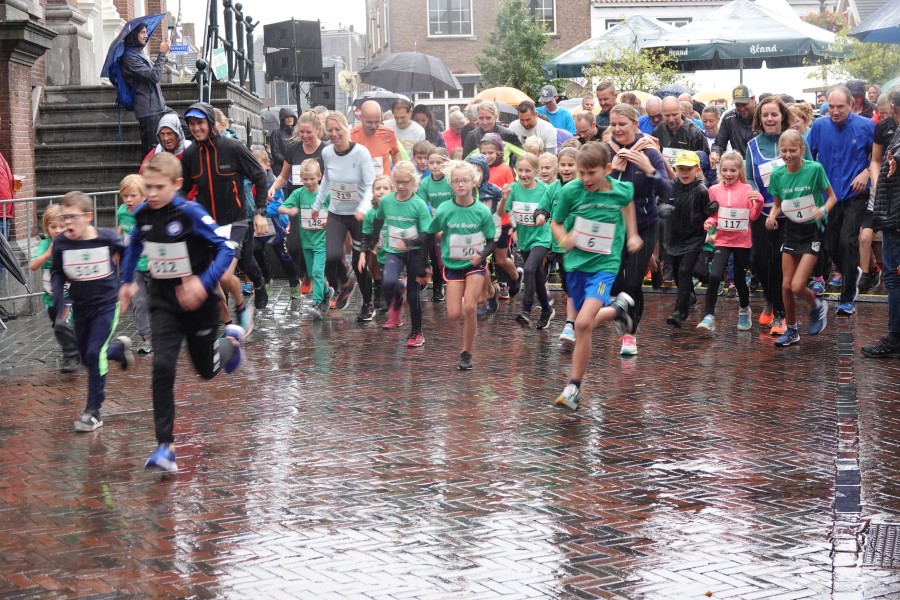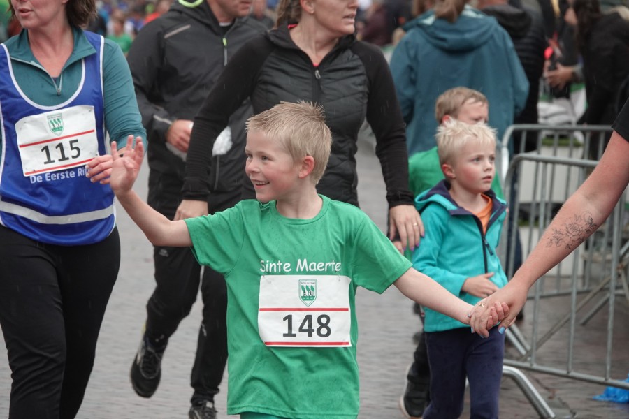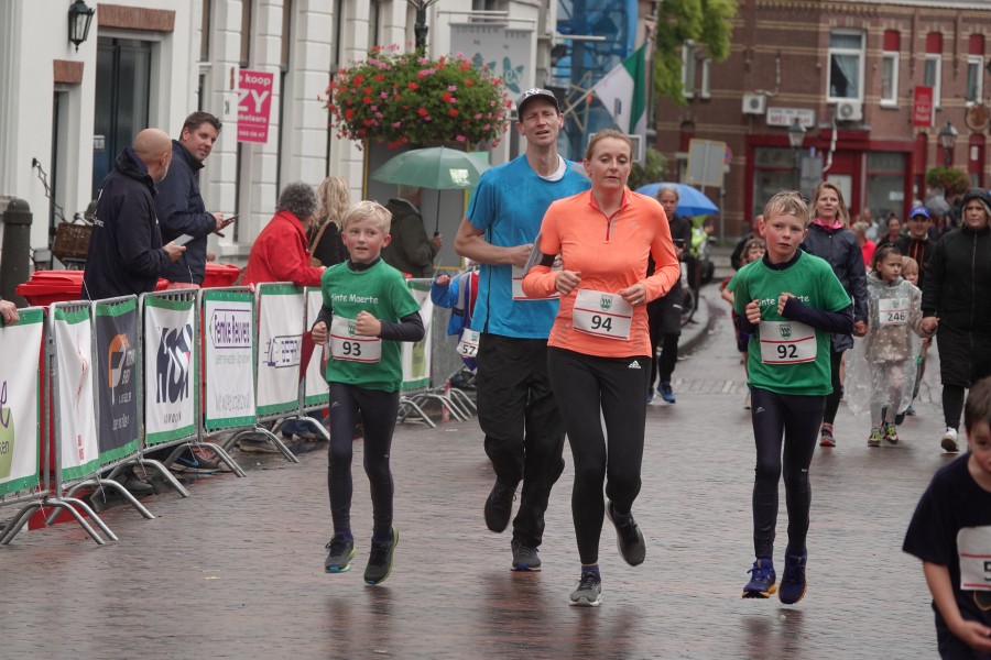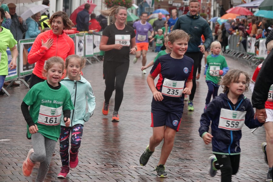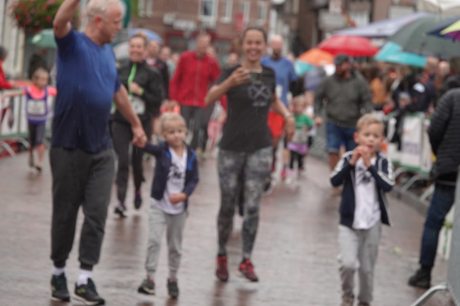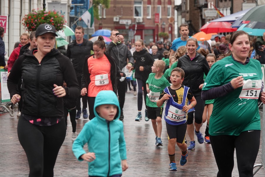 Onder droge omstandigheden begonnen de eerste lopers, alleen de snelsten kwamen droog over, maar de regen kon de pret niet drukken. Menig record sneuvelde en voor anderen was het gewoon een overwinning op jezelf. Zo had ieder zijn eigen motivatie om deel te nemen. Vervolgens ging de tien kilometer van start onder regenachtige omstandigheden. Gelukkig viel de regen mee toen de familieloop startte. Na een goede warming-up ging ook die van start, de ene liep een ronde de fanatiekeling onder ons liepen er zelfs drie. Gelukkig was iedereen voor de grote stortbui binnen.