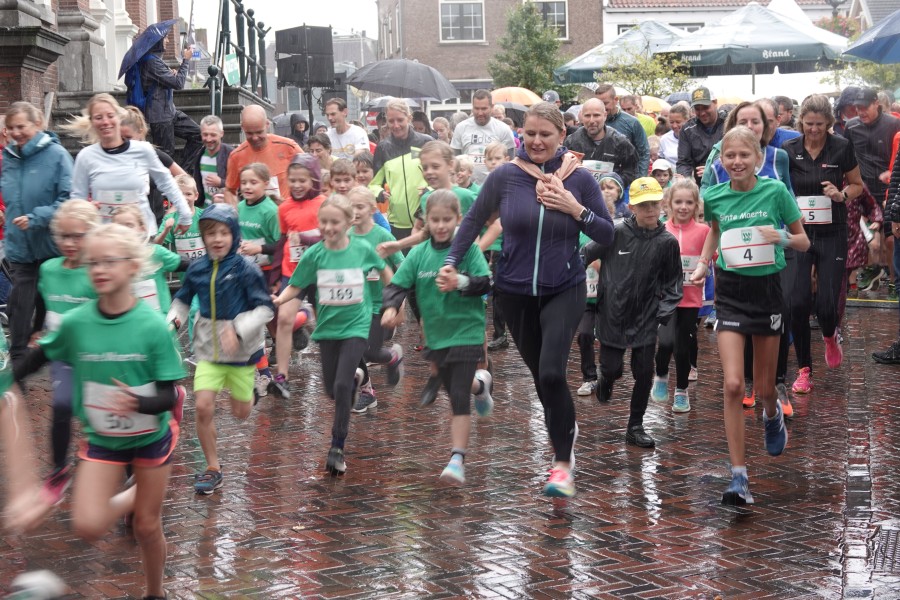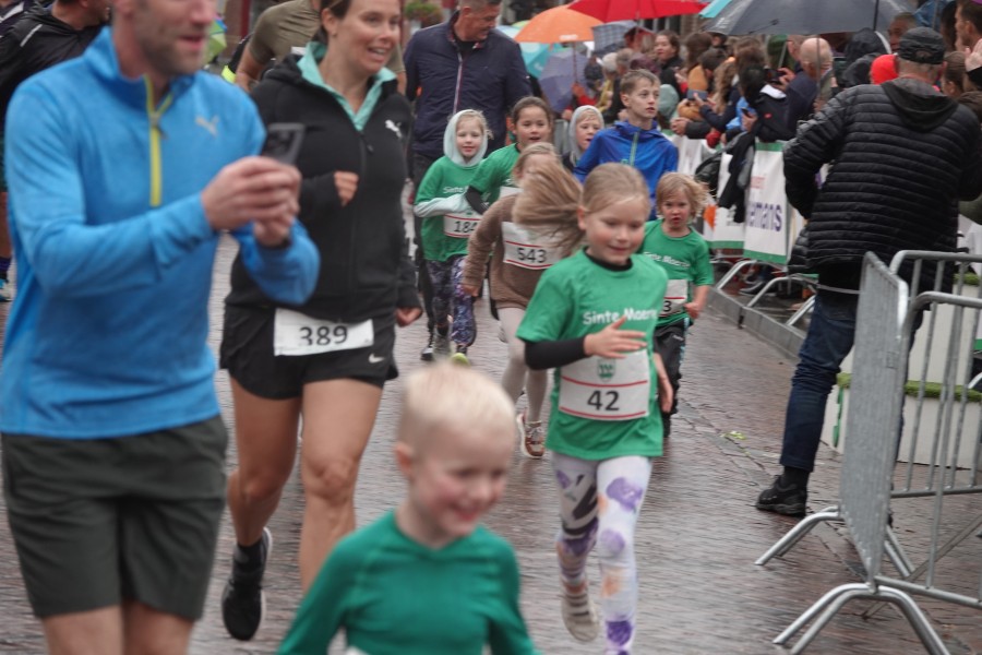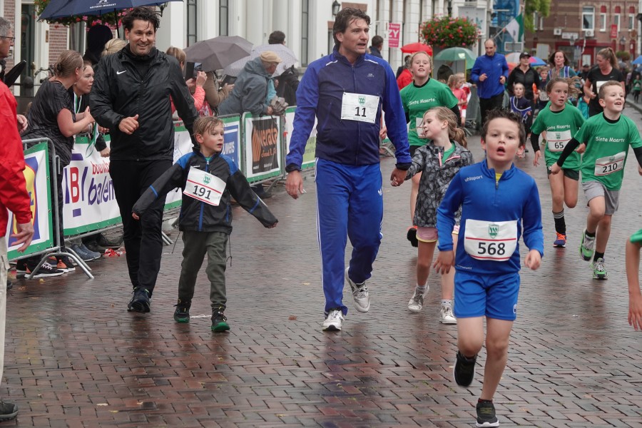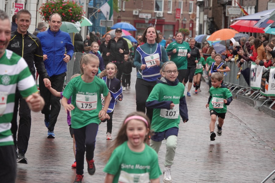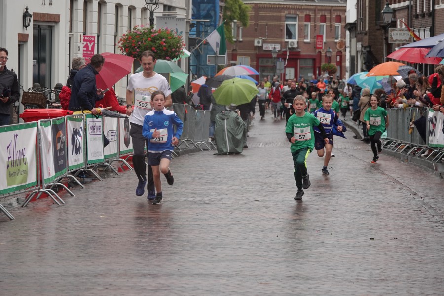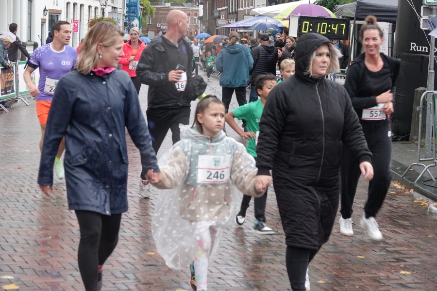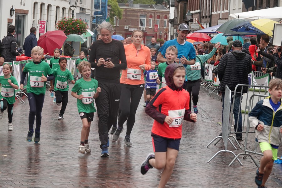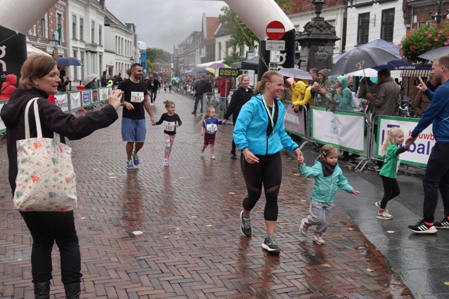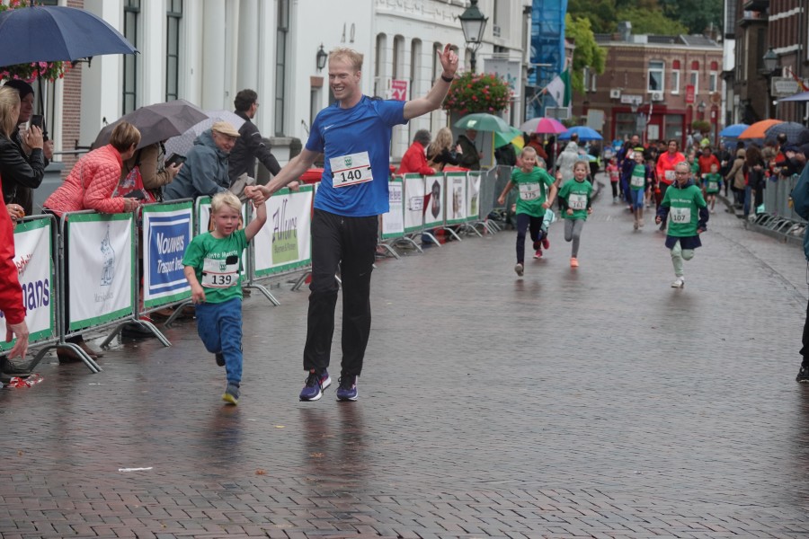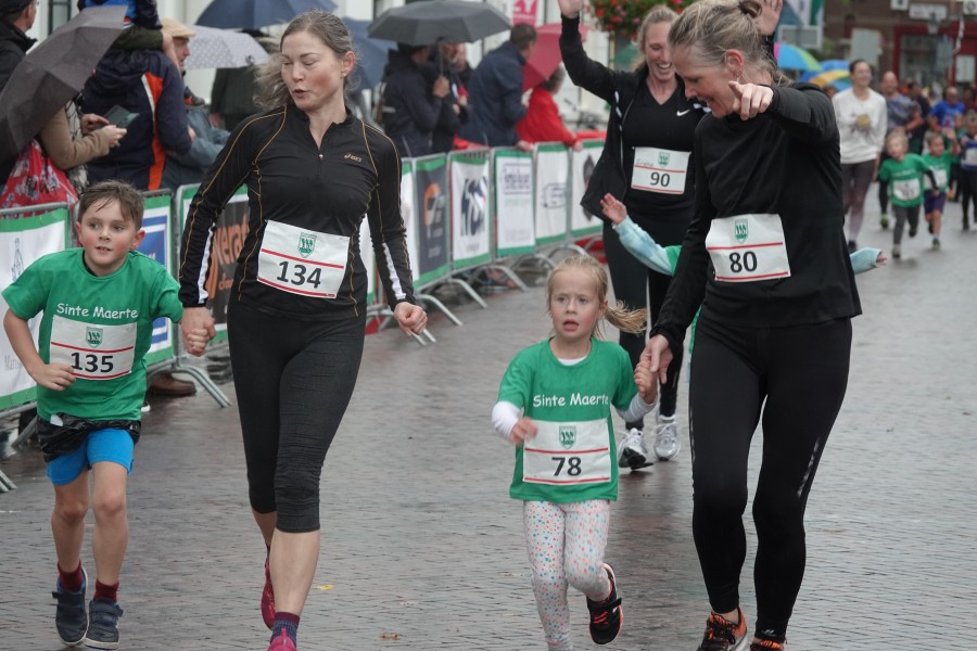 Onder droge omstandigheden begonnen de eerste lopers, alleen de snelsten kwamen droog over, maar de regen kon de pret niet drukken. Menig record sneuvelde en voor anderen was het gewoon een overwinning op jezelf. Zo had ieder zijn eigen motivatie om deel te nemen. Vervolgens ging de tien kilometer van start onder regenachtige omstandigheden. Gelukkig viel de regen mee toen de familieloop startte. Na een goede warming-up ging ook die van start, de ene liep een ronde de fanatiekeling onder ons liepen er zelfs drie. Gelukkig was iedereen voor de grote stortbui binnen.