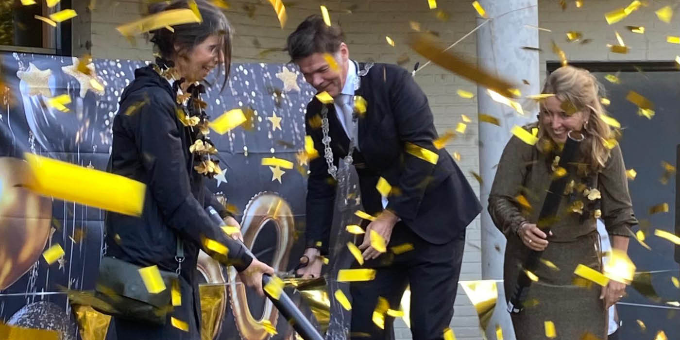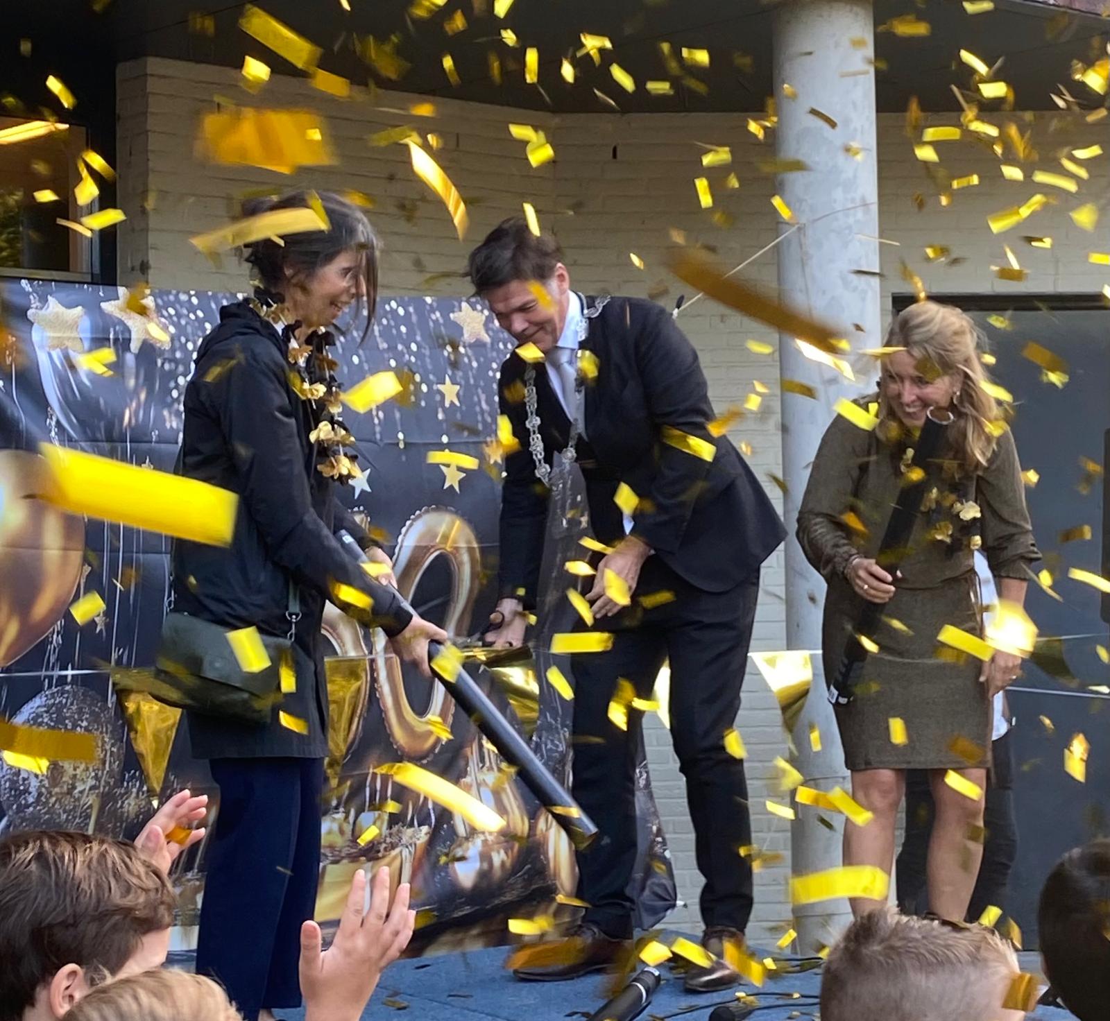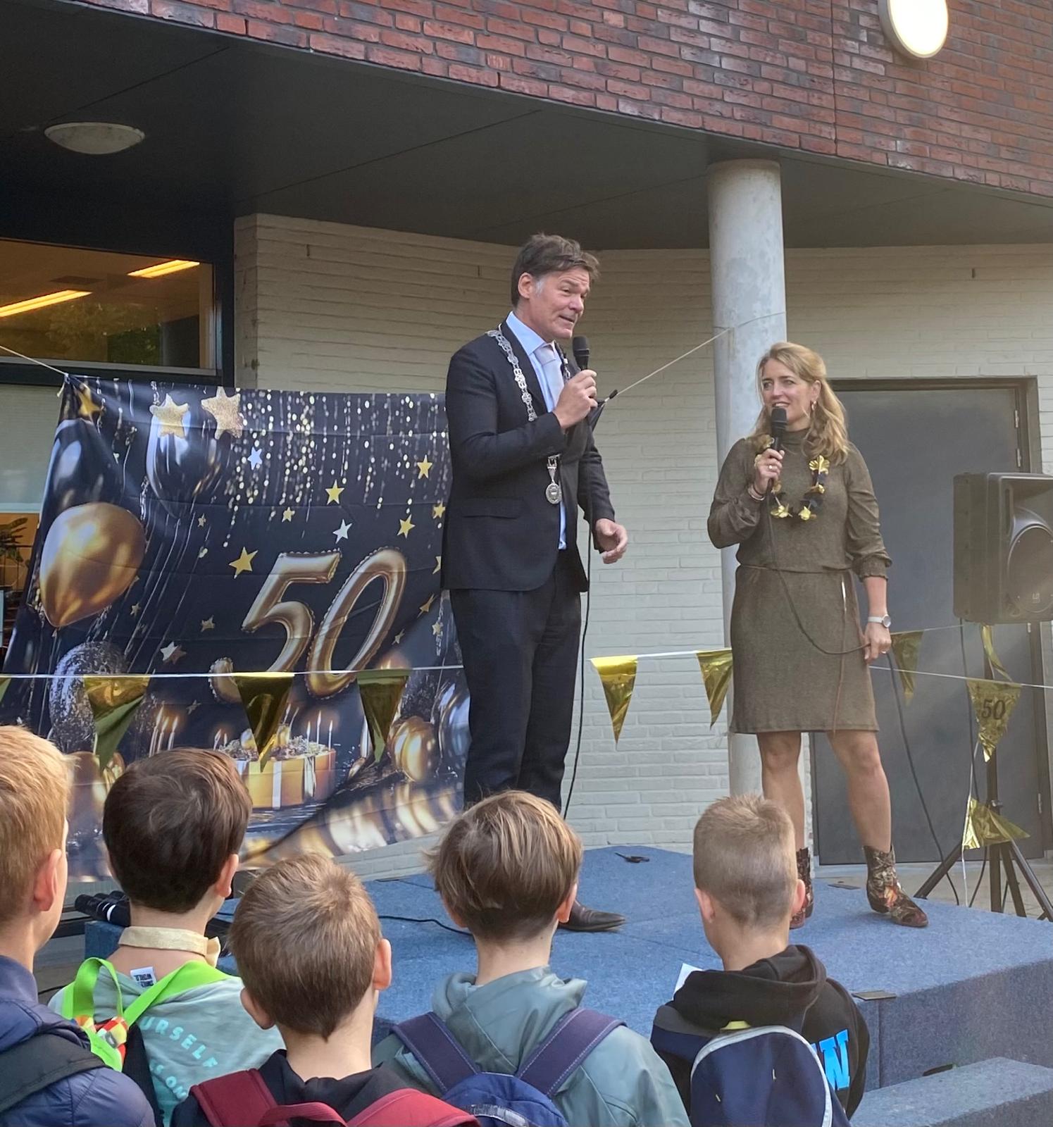 Terwijl een krachtige wind gouden poppers de wijk inblaast, honderden kinderen het schoollied van de Eerste Rith zingen, zien directeur Hilda Delacourt, INOS bestuurder Anneke van der Zee en burgemeester Paul Depla vanaf het podium hoe de jubileumweek van deze basisschool wordt geopend. De school bestaat 50 jaar en dat moet natuurlijk worden gevierd.
