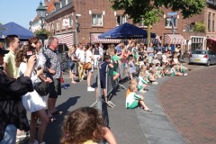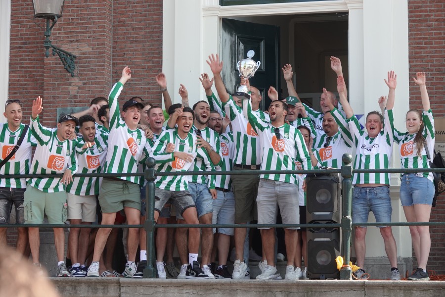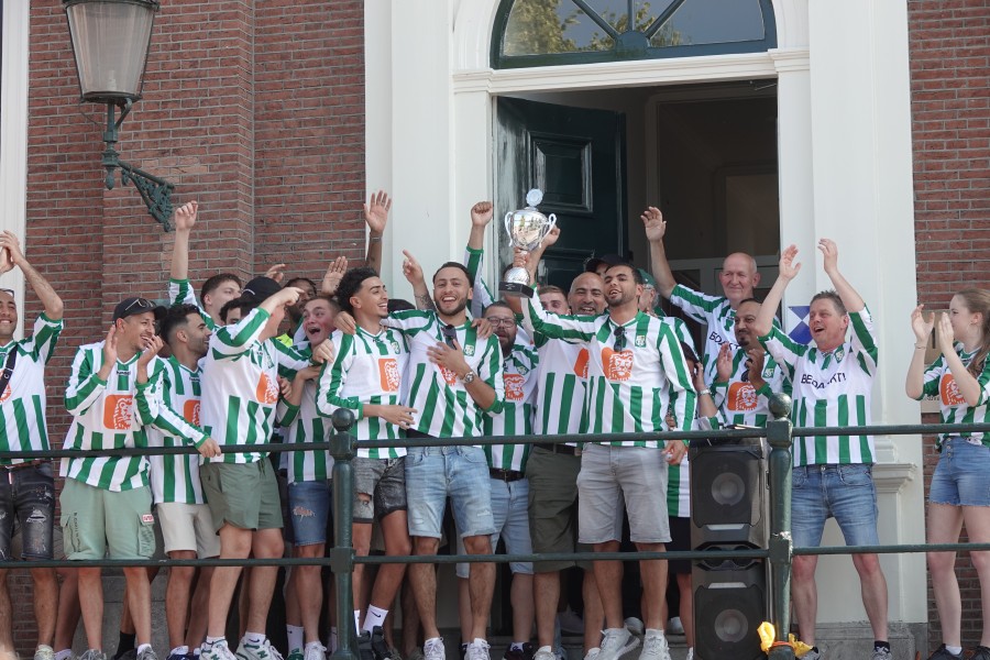 Op een warme Haagsemarkt is Groen Wit gehuldigd voor de bekerwinst van 18 mei jl. Helaas lukte het vorige week net niet om te promoveren naar de tweede klasse maar dat mocht vanmiddag de pret niet drukken want de beker winnen voor een derde klasser is erg knap. Gestart met 450 teams en dan de finale halen en winnen is een bijzondere prestatie. Ook wethouder Daan Quaars vond dit en hoopt dat Groen Wit het sprookje van Spakenburg gaat volgen want in het volgend seizoen gaan we Groen Wit zien in de Toto KNVB Beker.