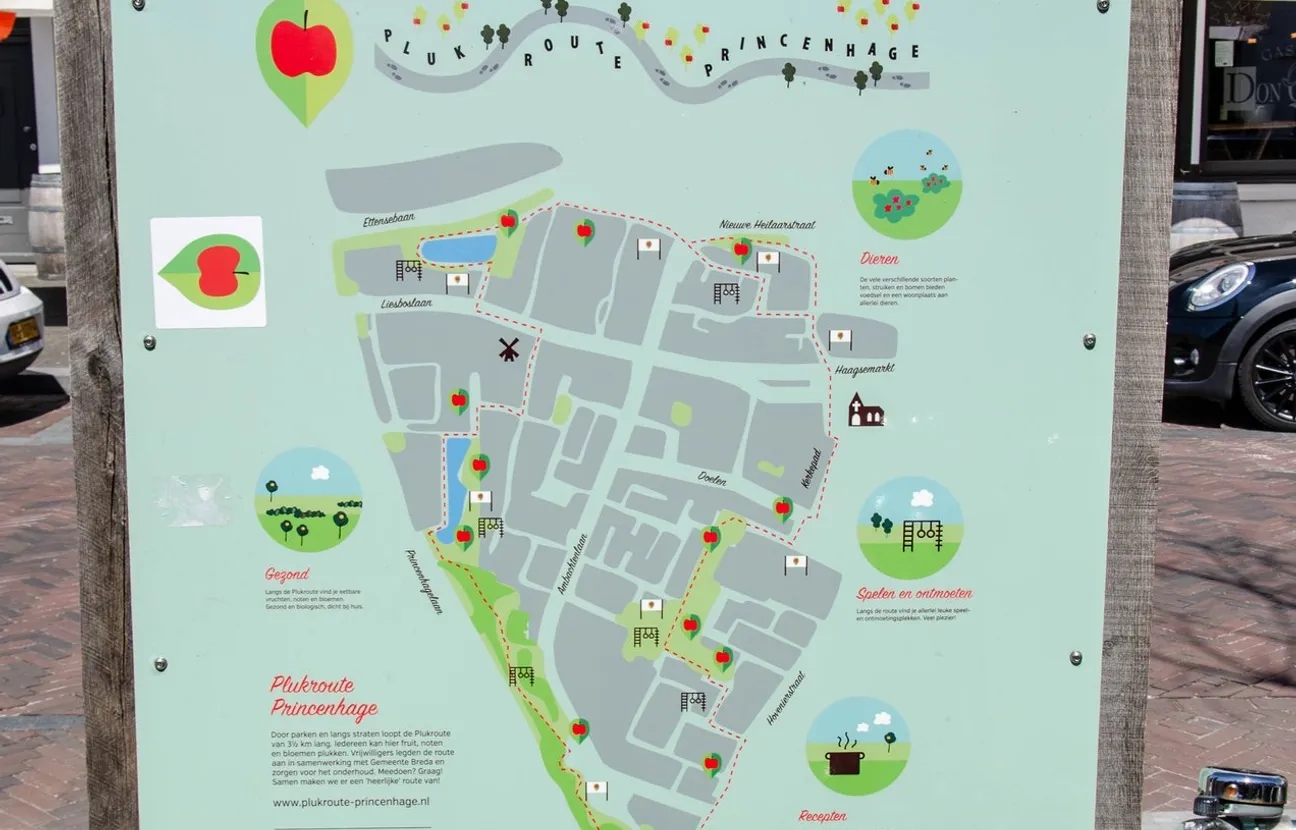 Hoe leuk is dit: Princenhage heeft een eigen plukroute! Een route door plantsoenen en straten waarlangs je letterlijk een heerlijke wandeling kunt maken. Van fruitbomen en struiken kun je de vruchten, bessen en noten oogsten, helemaal gratis! De route is aangegeven met stickers op lantaarnpalen en andere palen langs de weg. Op de Haagsemarkt staat een bord met de hele route. Extra leuk voor de kleintjes: er is ook een speurtocht uitgezet langs de route!