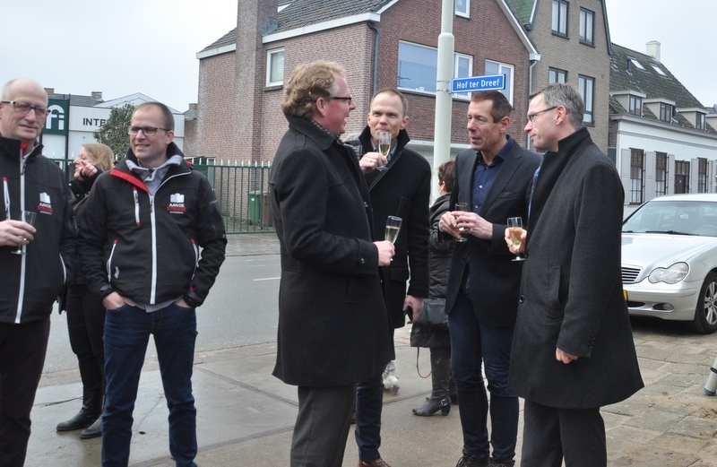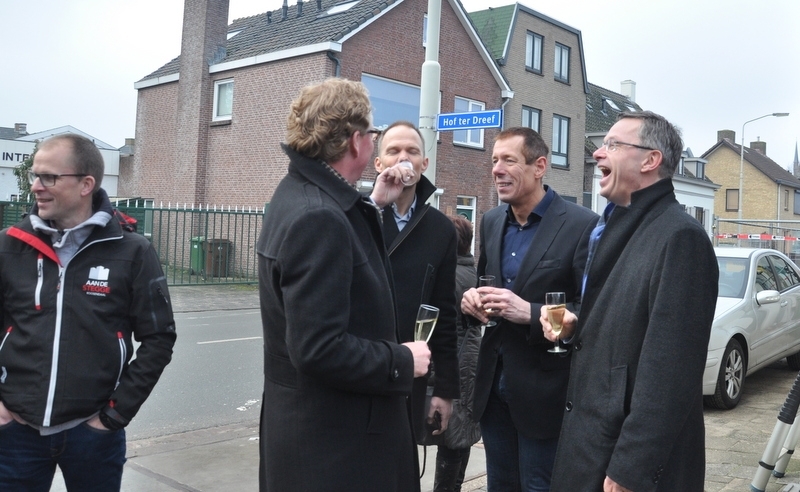 Richard Schul verwelkomde alle aanwezigen. “We wilden eerst een steen onthullen, maar aangezien niemand van de bewoners de steen tegen zijn gevel aan wilde, openen we de nieuwe straat met de onthulling van het naambordje”. Het was de eer aan wethouder Arbouw om het nieuwe straatnamenbord te onthullen, waarna er geproost werd door de bewoners.